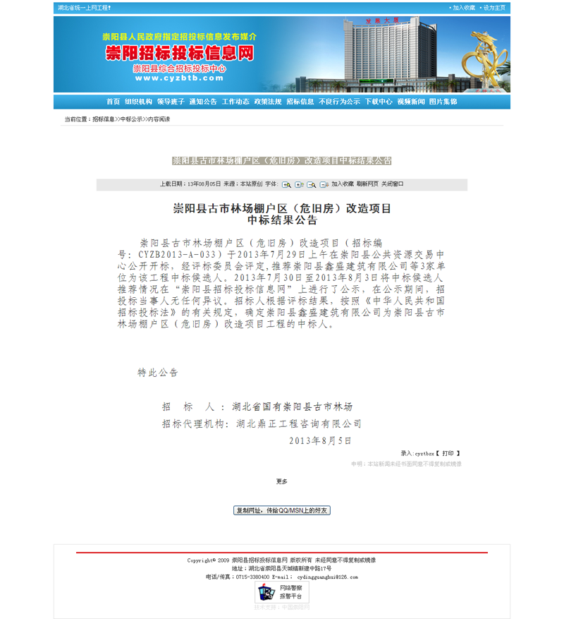 崇陽縣古市林場棚戶區(qū)(危舊房)改造項目中標(biāo)結(jié)果公告