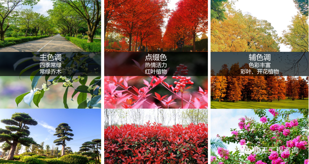 在“生態(tài)園區(qū)”的理念下,以常綠色系為背景色,并以有色系植物來進行層次的豐富,形成色彩繽紛靚麗,四季有花的景觀風貌。