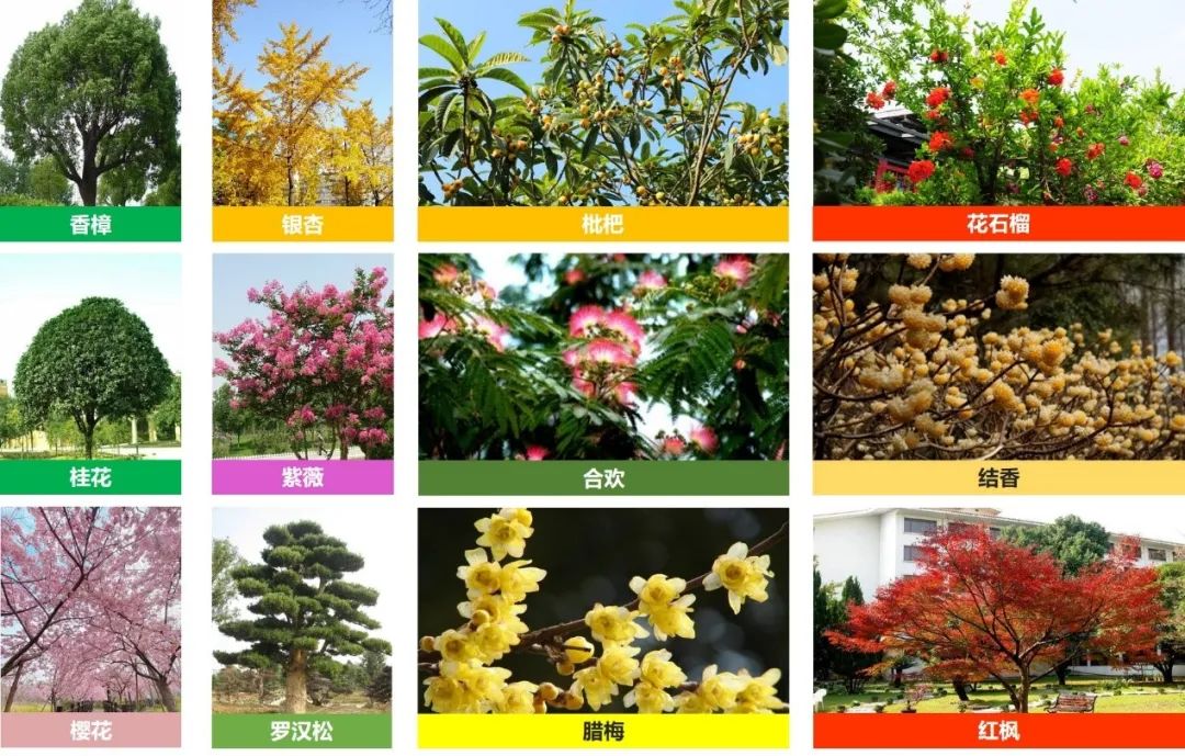(3)選擇樹形美觀,花色艷麗、景觀效果較好的樹種為開花小喬木及花灌木,如:櫻花、紫薇、花石榴、臘梅等。