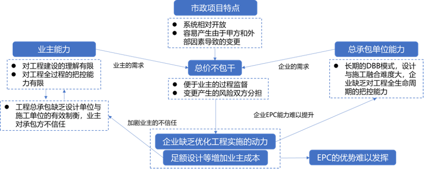 簡言之,市政項(xiàng)目的特點(diǎn)、業(yè)主和總承包單位的能力導(dǎo)致了市政工程項(xiàng)目是總價(jià)不包干的,而這使得總承包單位缺乏優(yōu)化設(shè)計(jì)施工融合的動(dòng)力,甚至使得總承包單位進(jìn)行設(shè)計(jì)與施工的畸形融合。而這一方面使得業(yè)主對推行工程總承包興趣缺失甚至存在抵觸,對總承包單位的管理能力建設(shè)遲緩,另一方面也使得總承包單位的工程總承包能力建設(shè)推進(jìn)緩慢,而這又進(jìn)一步固化了總價(jià)不包干的模式,從而使得工程總承包的優(yōu)勢難以發(fā)揮,由此,工程總承包推進(jìn)艱難。