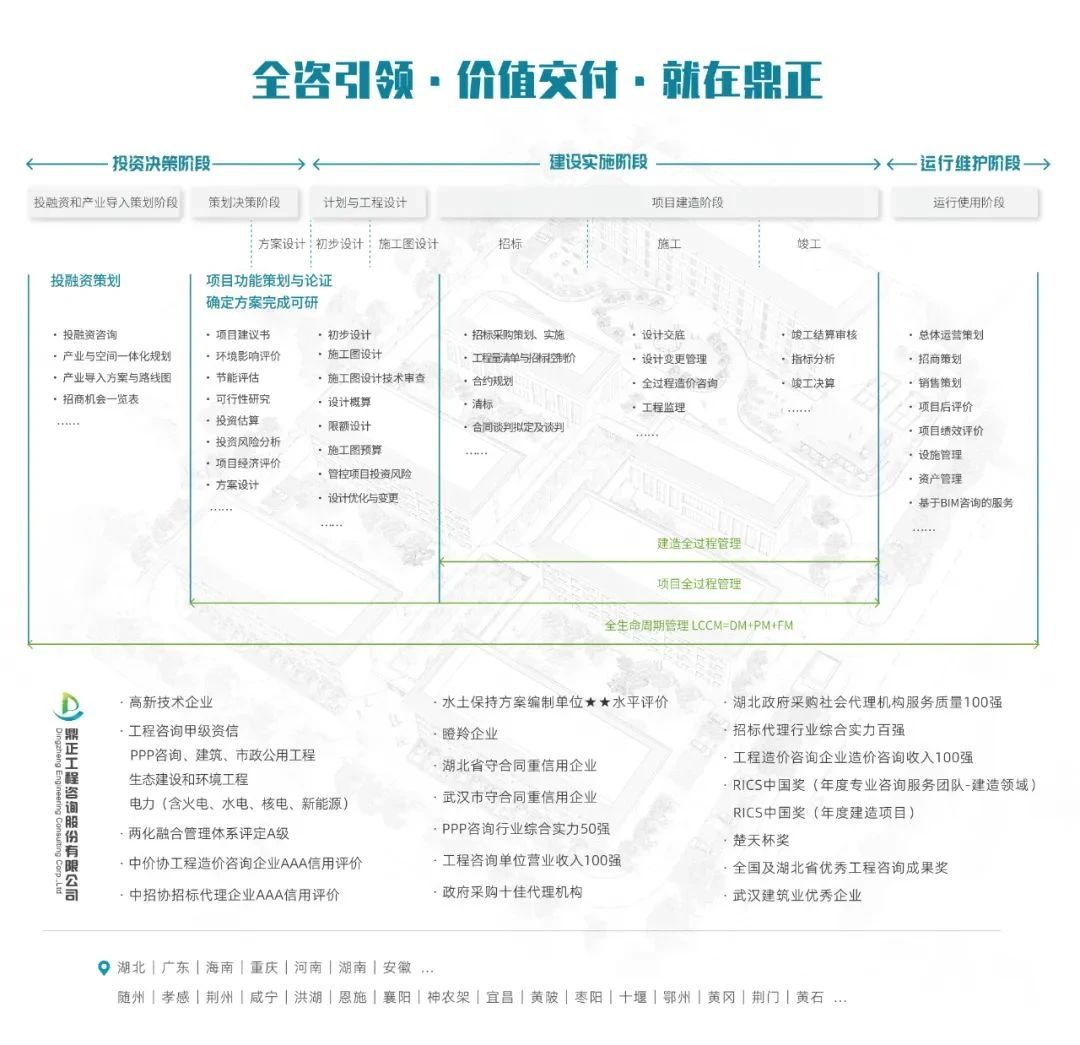 鼎正業(yè)務涵蓋設計咨詢產(chǎn)業(yè)鏈及工程產(chǎn)品產(chǎn)業(yè)鏈,既包括居住建筑、公共建筑、工業(yè)建筑等建筑設計領域,市政排水設計、市政道路設計等市政設計領域及景觀綠化設計領域,也包括全過程工程咨詢、全過程產(chǎn)業(yè)咨詢、投融資咨詢、項目管理、造價咨詢、造價與法律糾紛咨詢、招標代理等工程投資、造價、運營等業(yè)務。
