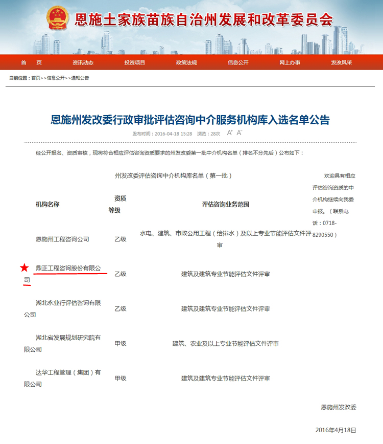 【經(jīng)營(yíng)成果】我司入圍恩施州發(fā)改委行政審批評(píng)估咨詢中介服務(wù)機(jī)構(gòu)庫(kù)
