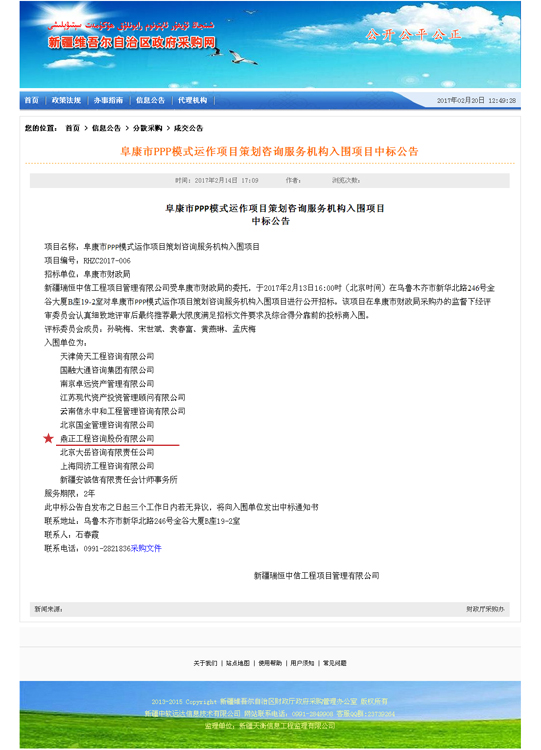 近日,新疆維吾爾自治區(qū)采購(gòu)網(wǎng)公布了阜康市PPP模式運(yùn)作項(xiàng)目策劃咨詢(xún)服務(wù)機(jī)構(gòu)入圍項(xiàng)目中標(biāo)公告,我司成功入圍。