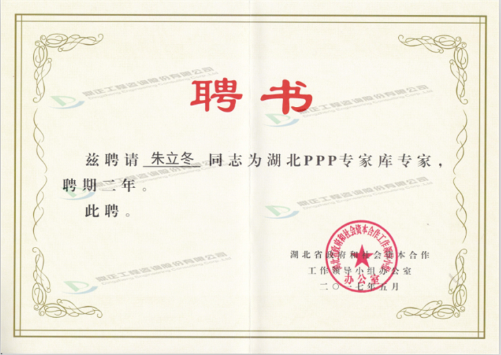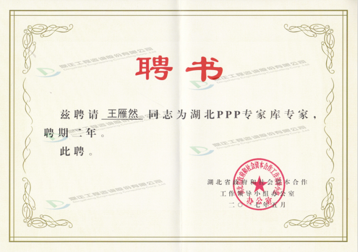 近日,湖北省政府和社會資本合作工作領(lǐng)導小組辦公室授予鼎正公司董事長王雁然先生、副總經(jīng)理兼技術(shù)總監(jiān)朱立冬教授為湖北省PPP專家?guī)鞂<摇4饲?/SPAN>,我司王雁然先生、朱立冬教授、張宏亮先生已入選湖北省財政廳PPP專家?guī)鞂<遥硗猓跹闳幌壬€被崇陽縣人民政府聘為崇陽縣PPP項目專家顧問。