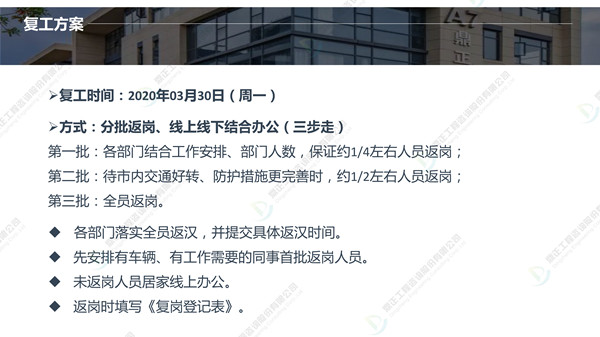 隨著武漢疫情防控形勢向好發(fā)展,3月28日上午,鼎正公司中層召開線上視頻會議,就復(fù)工防疫準(zhǔn)備工作展開討論,并形成復(fù)工方案如下: