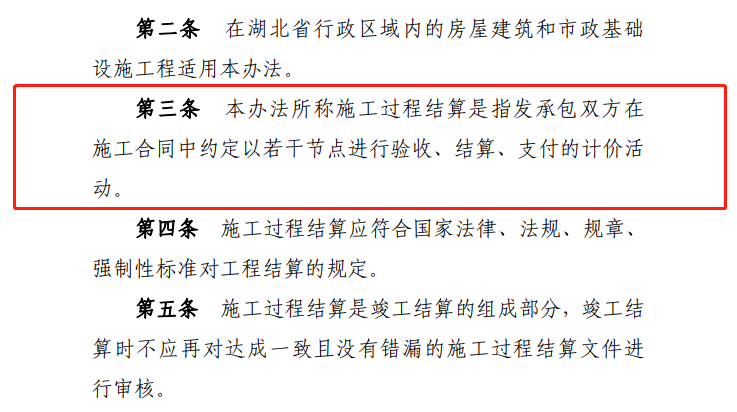 本條定義何為施工過程結(jié)算,相較住建部2021年發(fā)布的《建筑工程施工發(fā)包與承包計價管理辦法》(修訂征求意見稿)第十九條規(guī)定“全面推行施工過程結(jié)算和支付。發(fā)承包雙方通過合同約定,按時間節(jié)點或進度節(jié)點對周期內(nèi)已完成且無爭議的工程量進行價款計算、確認,并按照合同約定比例支付。”《暫行辦法》增加了節(jié)點驗收,驗收是節(jié)點結(jié)算與支付的前提。
