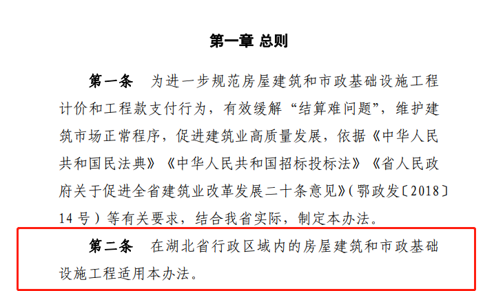 自本辦法實施之日起,湖北省內(nèi)的房屋建筑和市政基礎設施工程適用本辦法,不區(qū)分資金性質(zhì)。施工工程是否必須適用本《暫行辦法》,則需結(jié)合項目進展情況而定:已進行招投標或已簽訂合同的工程,仍按原約定執(zhí)行,已發(fā)包暫未確定中標單位的,招標人可發(fā)布澄清公告對結(jié)算方式進行變更,也可以按原約定繼續(xù)進行。