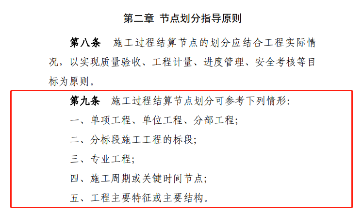《暫行辦法》分為總則、節(jié)點劃分指導原則、招投標與合同約定、結(jié)算與支付、監(jiān)督管理、附則等六個章節(jié),共二十六個條文,具體如下