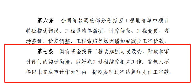 推行過程結(jié)算,建設單位應滿足施工所需的資金安排,工程驗收通過時原則上應同步完成工程款結(jié)算,不得變相拖延結(jié)算。國有資金投資工程應當按照國家有關規(guī)定確保資金按時支付到位,不得以未完成審計作為延期工程款結(jié)算的理由。在以往的建設工程司法案例中,合同雙方若在合同中約定以行政審計后的價款作為結(jié)算價款的,法院予以支持。眾所周知,行政審計一般在項目驗收完成之后進行,那么在推行施工過程結(jié)算的背景下,發(fā)包人在招標文件及合同條款中再約定以行政審計后的價款作為結(jié)算依據(jù)的,明顯與過程結(jié)算的推行意義相違背。