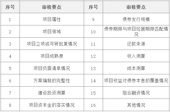 資料審核通過,進入發(fā)行庫,待發(fā)行。各省財政廳對發(fā)行文件進行審核,著重對《可研報告》與《實施方案》進行審核,審核要點如下:各省財政廳對項目的審批程序進行審核,項目達到開工條件后正式發(fā)行,審批程序?qū)徍耸马椙鍐稳缦拢?/span>