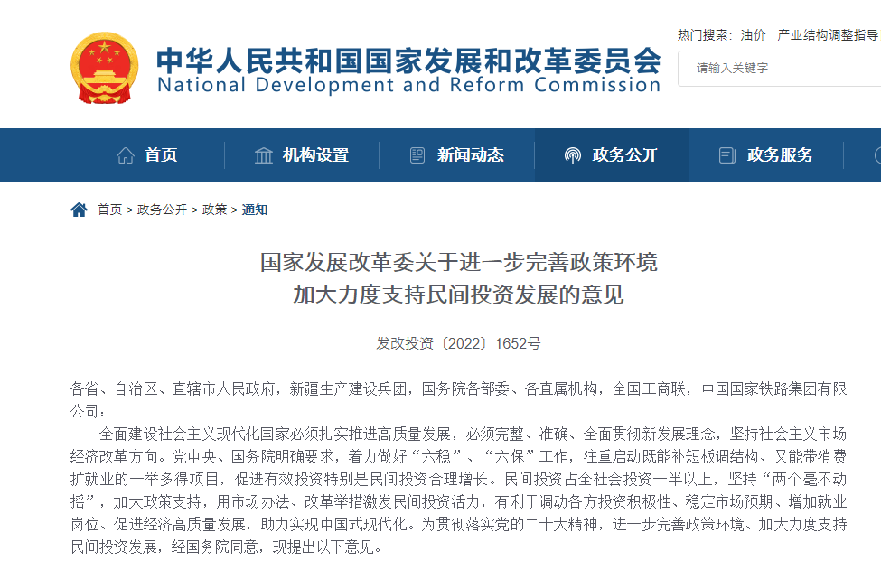 全面建設(shè)社會(huì)主義現(xiàn)代化國(guó)家必須扎實(shí)推進(jìn)高質(zhì)量發(fā)展,必須完整、準(zhǔn)確、全面貫徹新發(fā)展理念,堅(jiān)持社會(huì)主義市場(chǎng)經(jīng)濟(jì)改革方向。黨中央、國(guó)務(wù)院明確要求,著力做好“六穩(wěn)”、“六保”工作,注重啟動(dòng)既能補(bǔ)短板調(diào)結(jié)構(gòu)、又能帶消費(fèi)擴(kuò)就業(yè)的一舉多得項(xiàng)目,促進(jìn)有效投資特別是民間投資合理增長(zhǎng)。民間投資占全社會(huì)投資一半以上,堅(jiān)持“兩個(gè)毫不動(dòng)搖”,加大政策支持,用市場(chǎng)辦法、改革舉措激發(fā)民間投資活力,有利于調(diào)動(dòng)各方投資積極性、穩(wěn)定市場(chǎng)預(yù)期、增加就業(yè)崗位、促進(jìn)經(jīng)濟(jì)高質(zhì)量發(fā)展,助力實(shí)現(xiàn)中國(guó)式現(xiàn)代化。為貫徹落實(shí)黨的二十大精神,進(jìn)一步完善政策環(huán)境、加大力度支持民間投資發(fā)展,經(jīng)國(guó)務(wù)院同意,現(xiàn)提出以下意見。