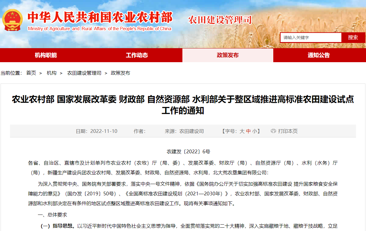 為深入貫徹黨中央、國務(wù)院有關(guān)部署要求,落實(shí)中央一號(hào)文件精神,依據(jù)《國務(wù)院辦公廳關(guān)于切實(shí)加強(qiáng)高標(biāo)準(zhǔn)農(nóng)田建設(shè) 提升國家糧食安全保障能力的意見》(國辦發(fā)〔2019〕50號(hào))、《全國高標(biāo)準(zhǔn)農(nóng)田建設(shè)規(guī)劃(2021—2030年)》,農(nóng)業(yè)農(nóng)村部、國家發(fā)展改革委、財(cái)政部、自然資源部和水利部決定在有條件的地區(qū)試點(diǎn)整區(qū)域推進(jìn)高標(biāo)準(zhǔn)農(nóng)田建設(shè)工作。現(xiàn)將有關(guān)事項(xiàng)通知如下。