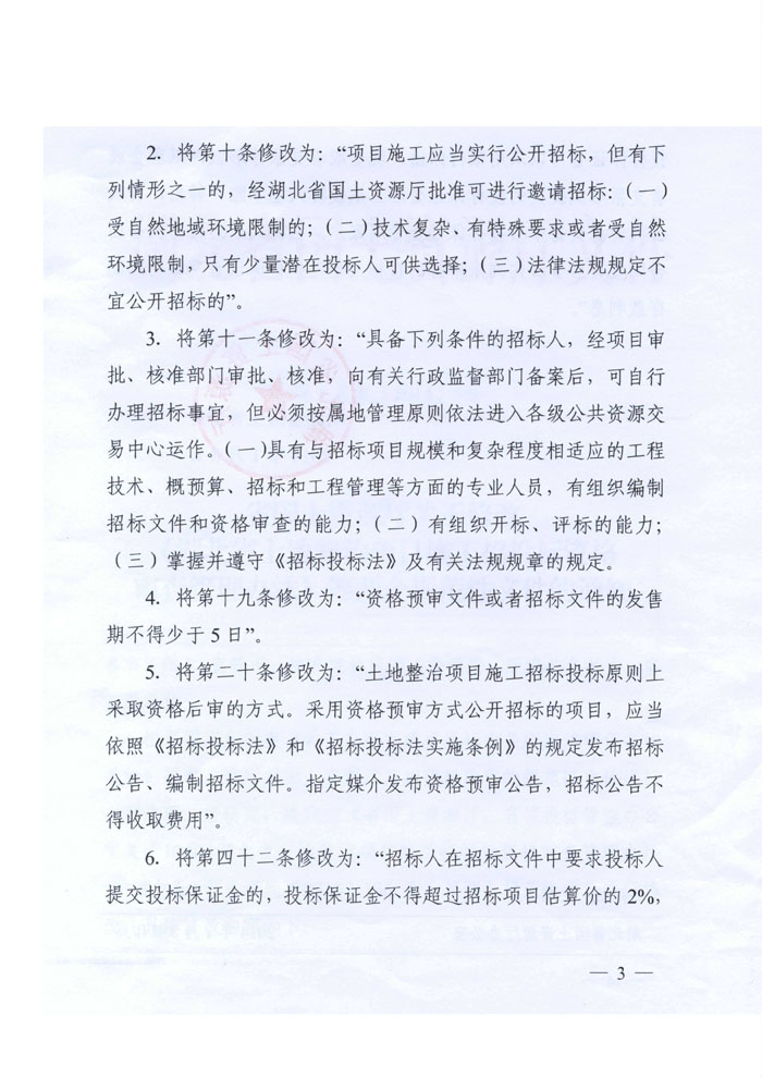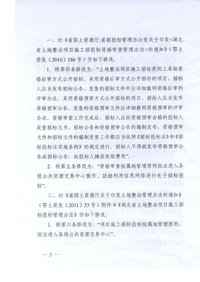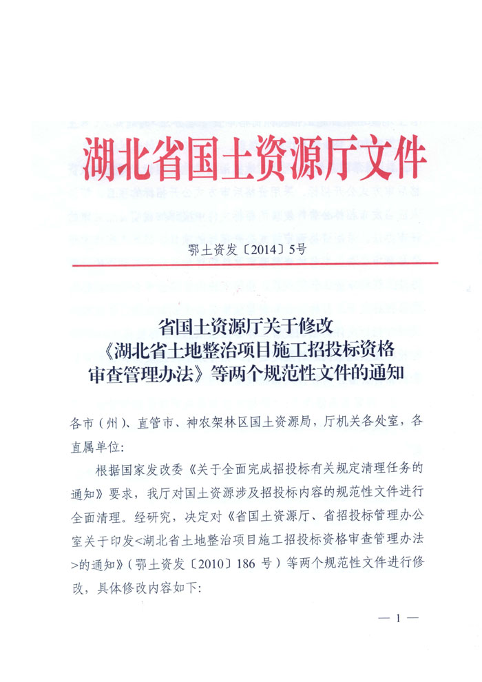 湖北省國土資源廳關(guān)于修改《湖北省土地整治項(xiàng)目施工招投標(biāo)資格審查辦法》等兩個(gè)規(guī)范性文件的通知