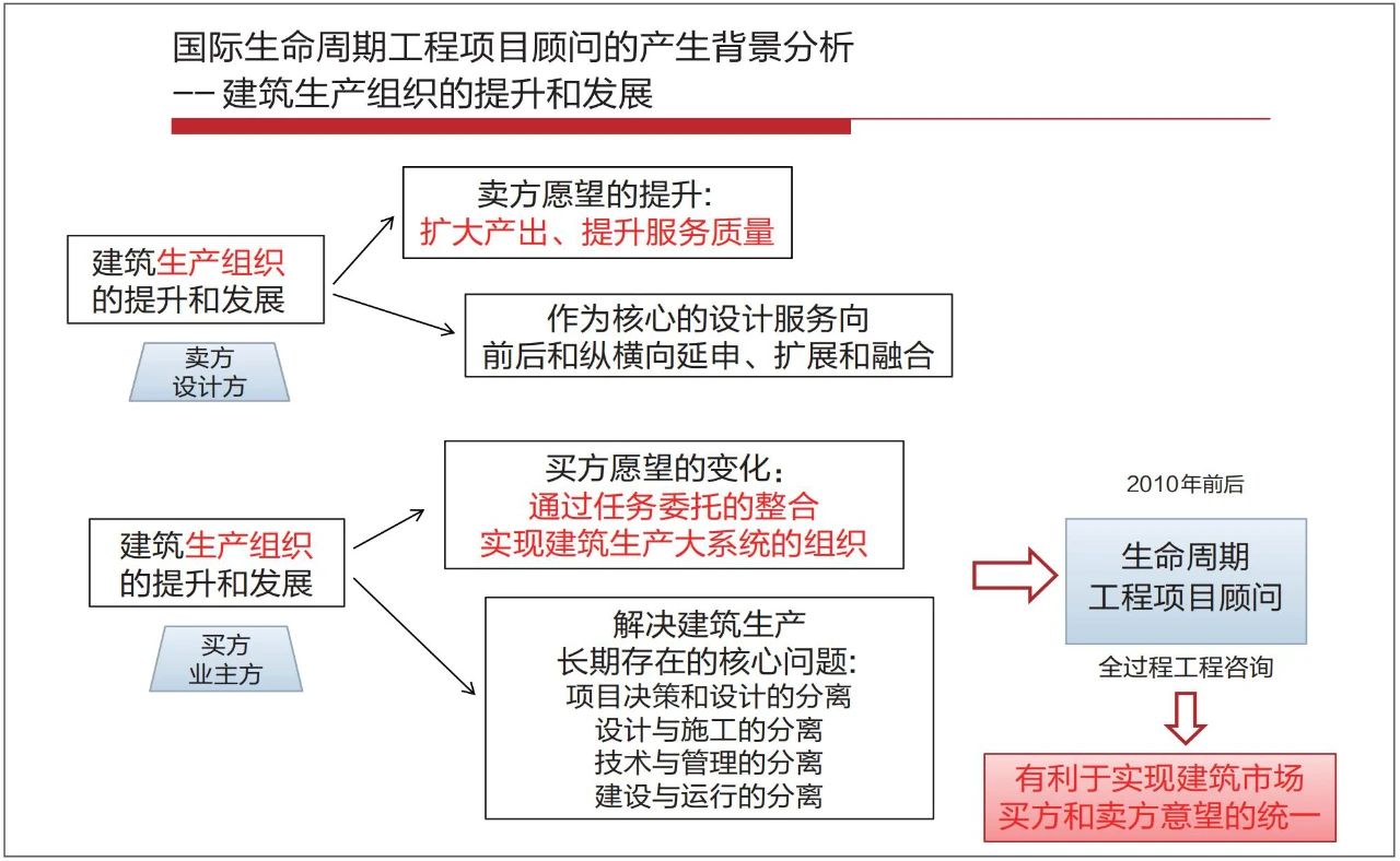 通過以上分析可以看出,國(guó)際生命周期工程項(xiàng)目顧問是因建筑市場(chǎng)上買方和賣方雙方的積極性而產(chǎn)生的,為建筑生產(chǎn)的組織形成一種新的模式。另外,關(guān)于國(guó)際生命周期工程項(xiàng)目顧問的特征和發(fā)展趨勢(shì)分析,也是可以供我國(guó)建筑業(yè)企業(yè)參考的。