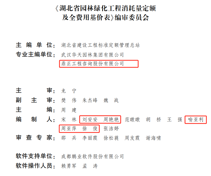 鼎正作為《湖北省園林綠化工程消耗量定額及全費(fèi)用基價(jià)表》《湖北省建筑安裝工程費(fèi)用定額》的參編單位之一,充分發(fā)揮全過(guò)程工程咨詢資源集中的優(yōu)勢(shì),為此次定額的修訂貢獻(xiàn)了鼎正在全過(guò)程工程咨詢、工程造價(jià)咨詢業(yè)務(wù)領(lǐng)域編審設(shè)計(jì)概算、投資估算、工程預(yù)算、過(guò)程結(jié)算、竣工結(jié)算等實(shí)踐經(jīng)驗(yàn),對(duì)進(jìn)一步完善工程造價(jià)計(jì)價(jià)依據(jù)體系提供了有力的技術(shù)支撐。