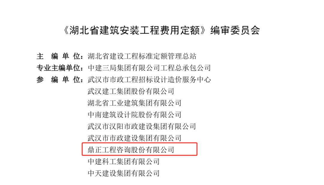鼎正高度重視標(biāo)準(zhǔn)化工作,多次參與國(guó)家、地方及行業(yè)標(biāo)準(zhǔn)編制。此次參與《湖北省建筑安裝工程費(fèi)用定額》《湖北省建筑安裝工程費(fèi)用定額》的定額編制,既是鼎正多年堅(jiān)持多年各咨詢板塊專業(yè)化沉淀和發(fā)展的集中體現(xiàn),更是鼎正履行推動(dòng)行業(yè)進(jìn)步、規(guī)范建設(shè)市場(chǎng)行為的專業(yè)職責(zé)所在。下一步,鼎正將繼續(xù)發(fā)揮專業(yè)優(yōu)勢(shì),集結(jié)公司更多骨干專家力量,為提升行業(yè)整體標(biāo)準(zhǔn)化水平、促進(jìn)行業(yè)的高質(zhì)量發(fā)展貢獻(xiàn)專業(yè)力量。