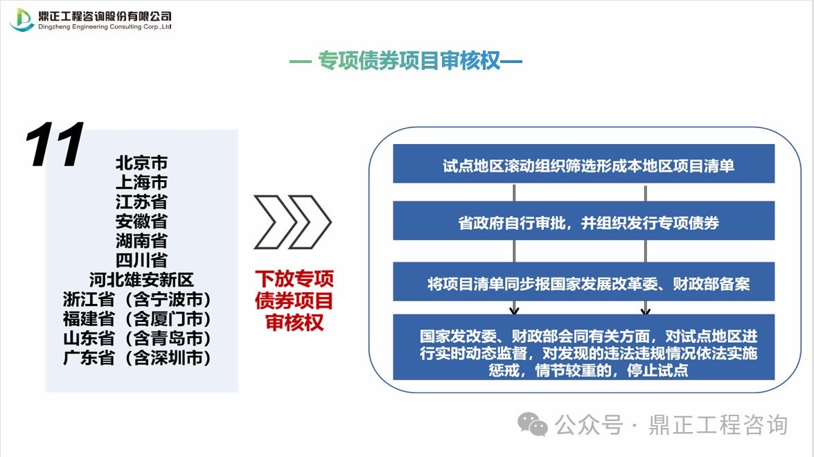 地方政府專項(xiàng)債券項(xiàng)目“自審自發(fā)”試點(diǎn)地區(qū)名單:北京市、上海市、江蘇省、浙江省(含寧波市)、安徽省、福建省(含廈門市)、山東省(含青島市)、湖南省、廣東省(含深圳市)、四川省、河北雄安新區(qū)等11個(gè)省市。