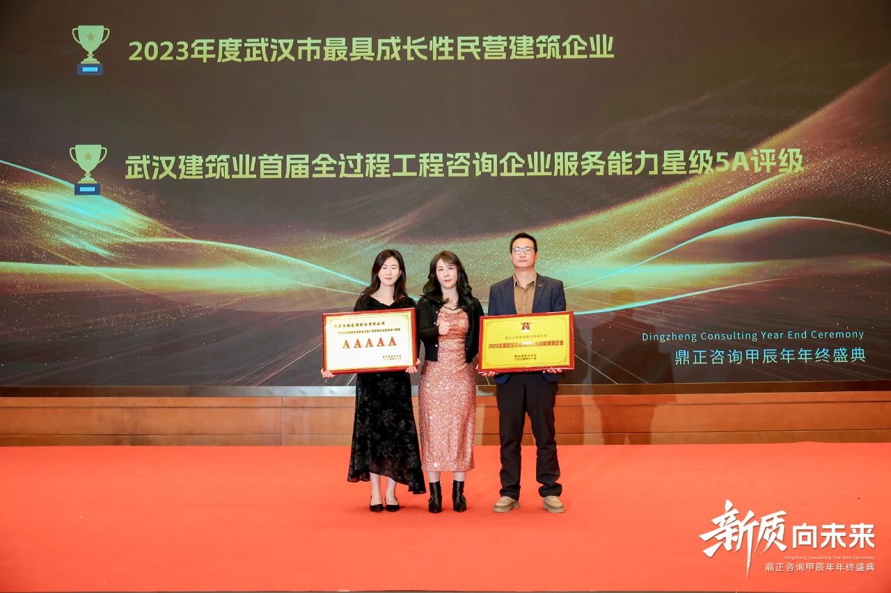 在過去的一年里,鼎正在專家輔助人、專項(xiàng)債、超長期特別國債、中央預(yù)算內(nèi)資金、全過程工程咨詢等業(yè)務(wù)板塊中,展現(xiàn)出強(qiáng)勁的創(chuàng)新力,并獲得行業(yè)廣泛的認(rèn)可。當(dāng)晚,武漢建筑業(yè)協(xié)會(huì)領(lǐng)導(dǎo)代表、全咨分會(huì)秘書長陳金琳女士,為我們頒發(fā)了2023年度武漢市最具成長性民營建筑企業(yè)、武漢建筑業(yè)首屆全過程工程咨詢企業(yè)服務(wù)能力星級(jí)5A評(píng)級(jí)兩項(xiàng)榮譽(yù)。
