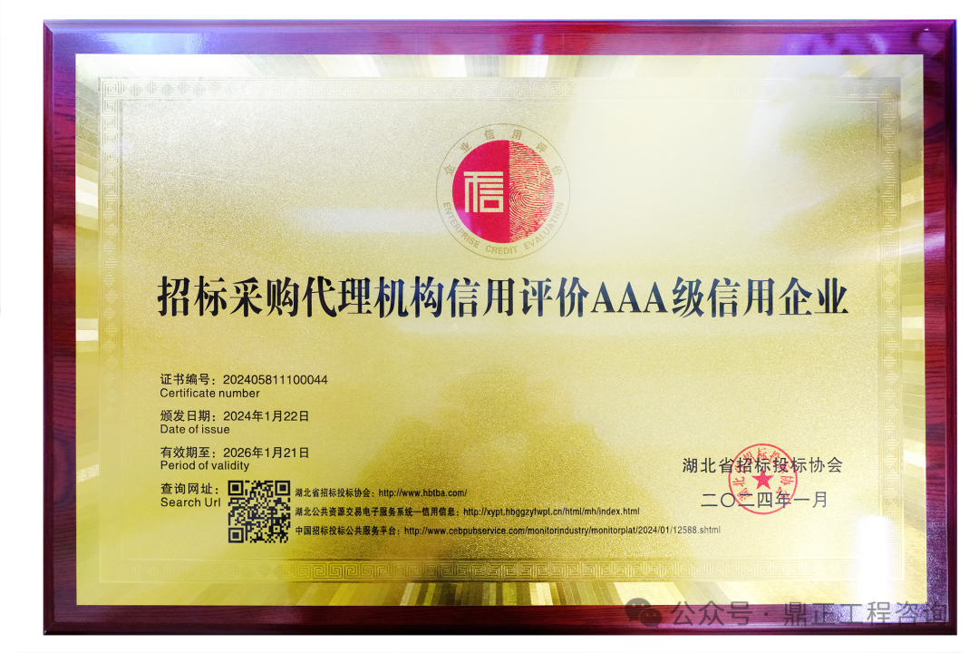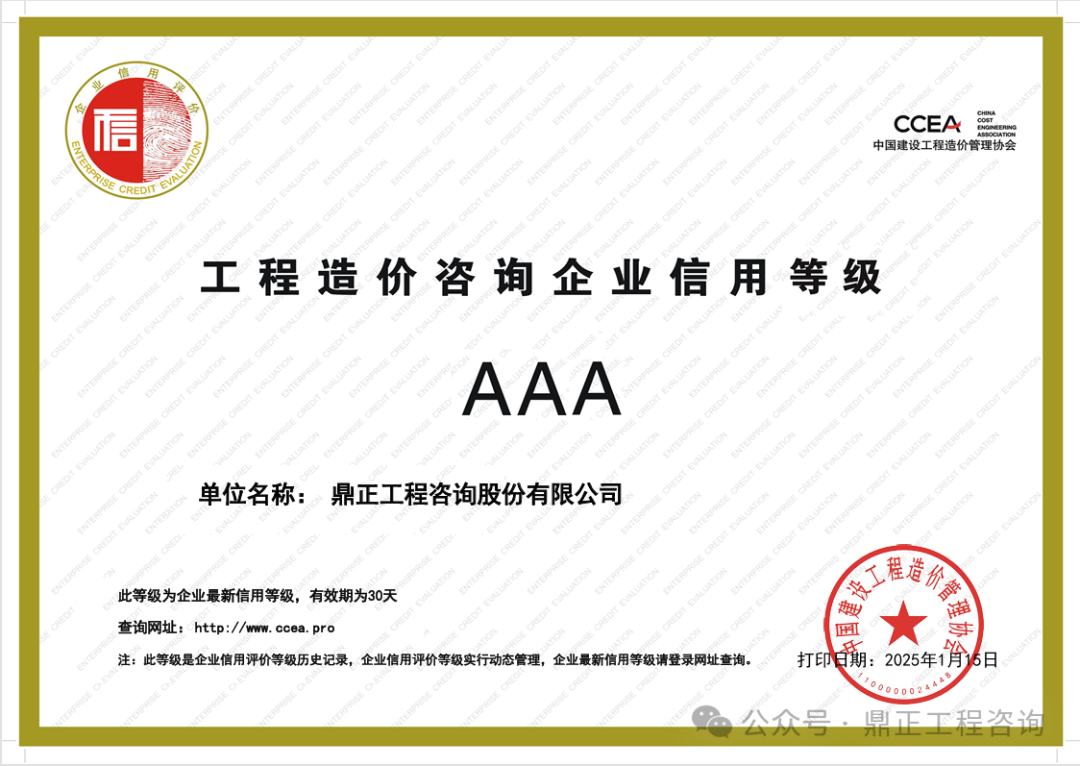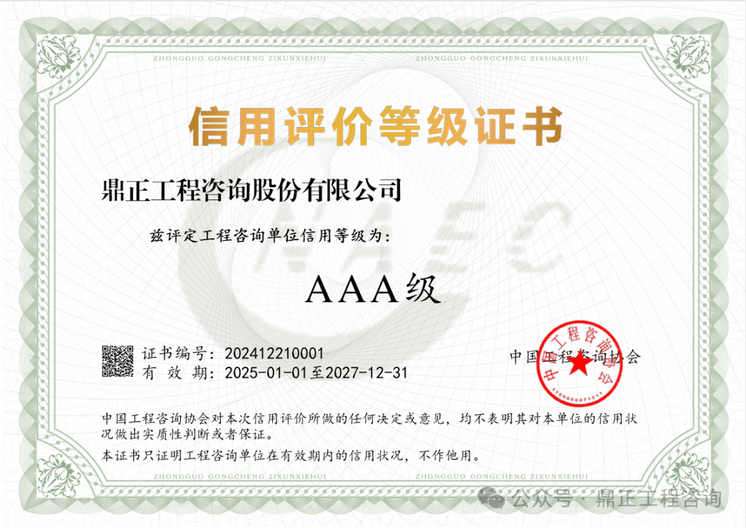 近日,中國工程咨詢協(xié)會(huì)發(fā)布了2024年度工程咨詢單位信用評價(jià)公告,鼎正憑借優(yōu)異的誠信建設(shè)和信用管理能力,榮獲“AAA級信用等級”評價(jià)。