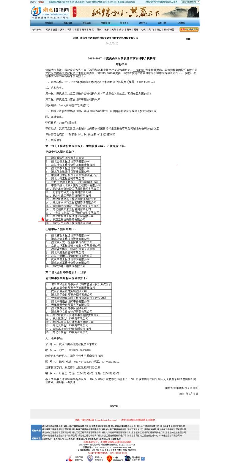 【經營成果】我司入圍2015-2017 年度洪山區(qū)財政投資評審項目中介機構庫