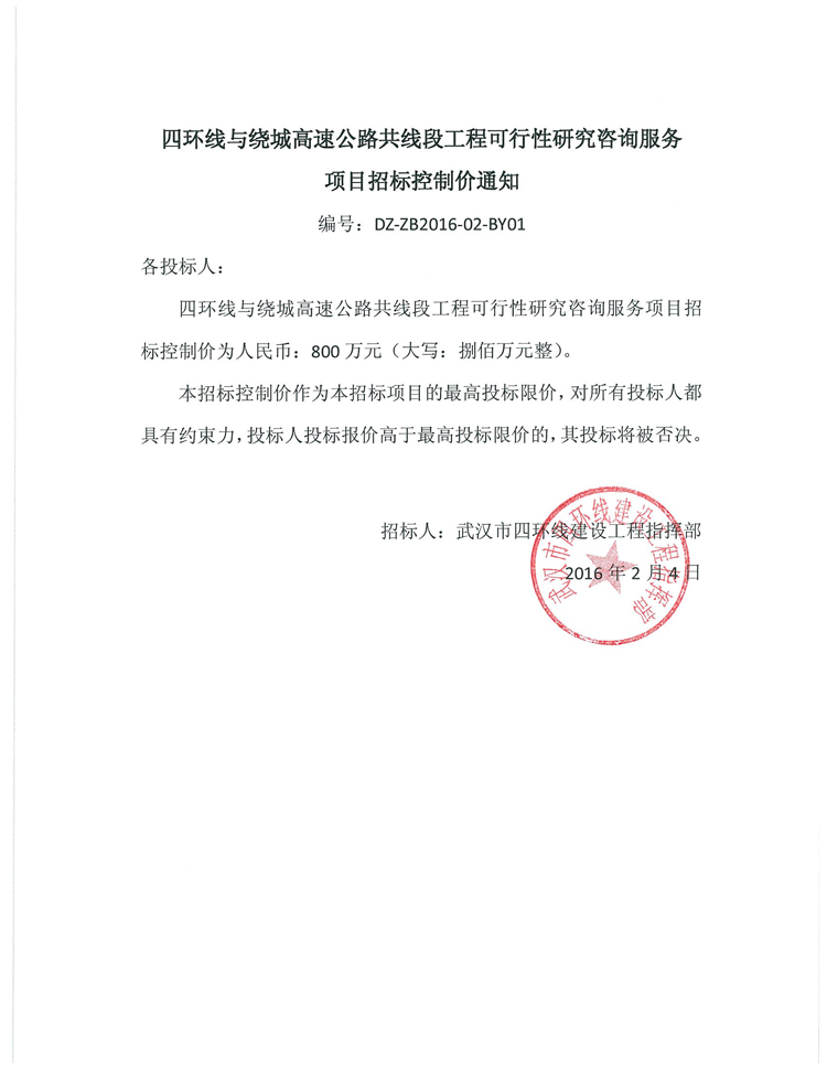四環(huán)線與繞城高速公路共線段工程可行性研究咨詢服務(wù)項(xiàng)目招標(biāo)控制價(jià)通知